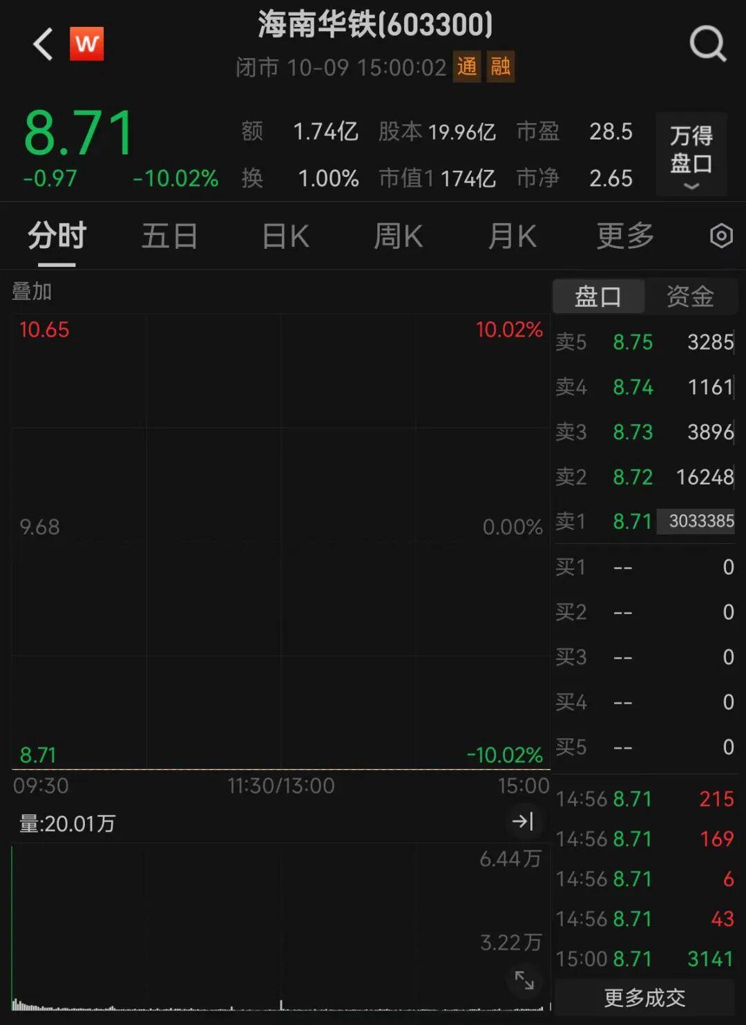 战战兢兢熬过了长假,10月9日开盘,海南华铁股价“一字”跌停,截至收盘,卖一位置仍有26.42亿元卖单正在排队。