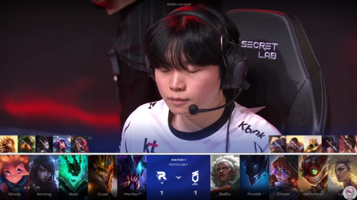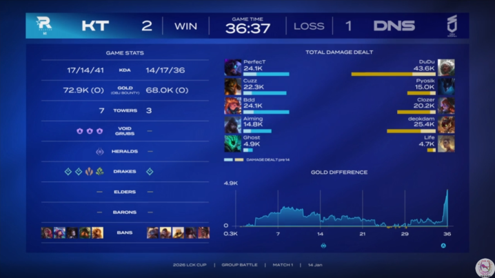 KT在第一局被DNS碾压之后,作为纸面实力更强的队伍,从第二局开始也是迅速调整BP阵容和选手状态,最终以让一追二的方式,2-1击败DNS还是拿下了这场2026年新赛季揭幕战的首秀胜利。BDD凭借连续2局的优秀表现,拿到了今天的POM最佳选手。看起来总决赛的遗憾结局并没有对他造成太大影响,无论是上个赛季还是这个赛季,BDD作为KT的核心,依然是最稳定的点。
